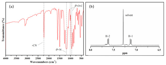 FTIR, 1H NMR, and elemental analyses were used to identify the chemical structure of CN-CP. In its FTIR spectrum (Figure 1a), 1205 cm−1 belonged to the characteristic absorption peak of P=N, and 939 and 1105 cm−1 were the characteristic absorption peaks of P–O–C. A strong absorption at 2227 cm−1 caused by –CN groups was clearly observed. In its 1H NMR spectrum (Figure 1b), doublets appeared at 7.61 and 7.12 ppm from H2 and H1 on the benzene ring of CN-CP, separate from the characteristic absorption of deuterated chloroform at 7.26 ppm. Results of elemental analysis (C = 76.674%, H = 3.956%, N = 19.370%) for CN-CP were relatively close to its theoretical values (C42H8O6N9P3: C = 77.051%, H = 3.695%, N = 19.255%)