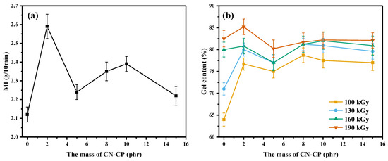 Melt index (a) and relationship between radiation dose and gel content (b) of the composites.