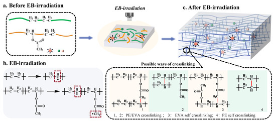 - Dadbin, S.; Frounchi, M.; Sabet, M. Studies on the properties and structure of electron-beam crosslinked low-density polyethylene/poly[ethylene-co-(vinyl acetate)] blends. Polym. Int. 2005, 54, 686–691. [Google Scholar] [CrossRef]