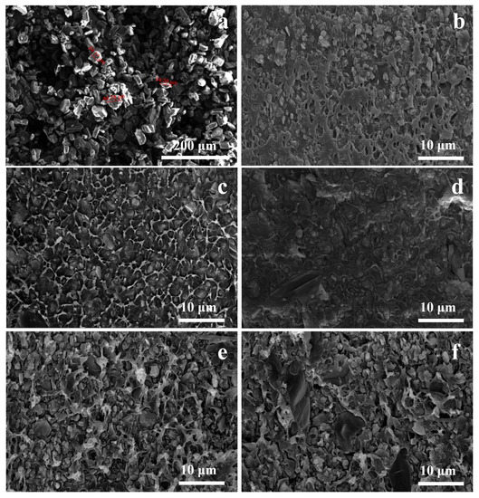 SEM images of CN-CP powder and its composites (a) CN-CP powder; (b) PE-CN-1; (c) PE-CN-2; (d) PE-CN-3; (e) PE-CN-4; (f) PE-CN-5.