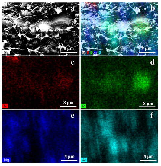 The EDX mapping images of N, P, Al, and Mg elements for the PE-CN-5 sample with a high CN-CP content are shown in Figure 5. We observed that N/P elements from organic fillers and Al/Mg elements from inorganic fillers were uniformly dispersed throughout the composites. Additionally, no Cl element was observed in the EDS spectrum, suggesting a complete substitution reaction during the preparation process of the CN-CP flame retardant.