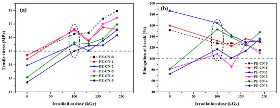 We subsequently conducted the tensile test of the composites before and after irradiation was conducted, as summarized in Figure 6. Results showed that the maximum tensile strength of the composites increased with increased irradiation dose, indicating that EB-irradiation helped improve the tensile strength of the composites. Furthermore, higher irradiation doses (>130 kGy) caused the simultaneous occurrence of crosslinking and degradation of the LDPE and EVA molecular chains, leading to a more complicated effect on tensile properties. This contradiction brought a fluctuation to the increasing trend of the strengths (Figure 6a). In some cases, the incorporation of CN-CP components even led to improved tensile properties. For example, at 100 kGy, the tensile strengths of PE-CN-1 and PE-CN-3 reached 16.61 and 16.54 MPa, which were higher than that (16.27 MPa) of PE-CN-0. PE-CN-1 and PE-CN-4 also had enhanced elongations at break compared with PE-CN-0 without CN-CP filler. Overall, the maximum tensile strength and elongation at break of most composites irradiated by high-energy EB were more than 15 MPa and 100%, respectively. These desired mechanical properties provided sufficient strength and flexibility for the composites to be used in wires and cables.
