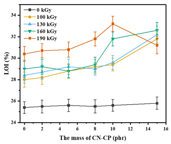 Limiting oxygen index (LOI) of the composites under different irradiation doses.