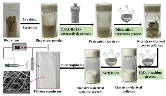 Schematic illustration of the preparation and electrospinning of rice straw-derived cellulose acetate.