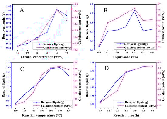 The number of active groups and the concentration of reactants in the reaction system were affected by the liquid–solid ratio of C2H5OH/H2O to rice straw powder. Therefore, it is necessary to optimize the liquid–solid ratio. As presented in Figure 2B, the amount of removal lignin increased firstly and, then, decreased, and the content of cellulose also increased firstly and, then, decreased as the liquid–solid ratio increased; moreover, the pH of the reaction system was in the range of 5.32–5.45. When the liquid–solid ratio was 12:1, the removal amount of lignin was the largest, and the cellulose content of pretreated rice straw also reached the maximum of 46.21%. After continuing to increase the liquid–solid ratio, both the removal amount of the lignin and the cellulose content were decreased. When the liquid–solid ratio was low, the number of active groups in the solvent was few, and the contact between the solvent and rice straw powder was not sufficient; moreover, the thermal capacity of the solvent system was so low that the pyrolysis and dissolution of lignin was weakened [31]. When the liquid–solid ratio was too large, the excessive C2H5OH was prone to esterify with CH3COOH produced by the C2H5OH/H2O autocatalytic process, which was not conducive to removing lignin from rice straw.