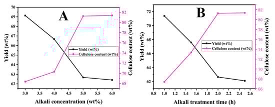 Optimization of the dilute alkali treatment process: (A) alkali concentration, (B) alkali treatment time.