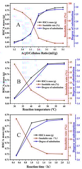 Optimization of the preparation conditions of RSCA: (A) Ac2O/cellulose ratio, (B) reaction temperature, (C) reaction time.