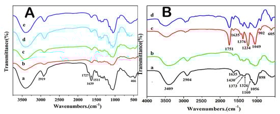 The chemical structure of products from rice straw to rice straw-derived cellulose at different stages were characterized by infrared spectroscopy, as was shown in Figure 5A. Curve (a) was the infrared spectrum of rice straw powder; the characteristic absorption peaks at 3413 cm−1 and 2919 cm−1 were assigned to stretching vibration of -OH and the hydrocarbon stretching vibration of -CH2-, respectively. The characteristic absorption peak at 1727 cm−1 corresponded to the aliphatic ether group in hemicellulose [33], and the adsorption peak at 1511 cm−1 was indexed to the aromatic ring skeleton of lignin. For the curve (b) of pretreated rice straw in Figure 5A, it is detected that the characteristic adsorption peaks of 1511 and 1727 cm−1 were obviously weakened, which indicated that the C2H5OH/H2O autocatalytic process could remove most hemicellulose and lignin. Curve (c) displayed the IR spectrum of pretreated rice straw after secondary washing by C2H5OH/H2O solution; it is obviously detected that the characteristic peak at 1511 cm−1 furtherly weakened, because the adsorbed lignin on the surface of pretreated rice straw powder could be washed off when the pretreated rice straw powder was washed by the same concentration of C2H5OH/H2O. For curves (d) and (e) in Figure 5A, the characteristic peak of 1511 cm−1 belonging to lignin completely disappeared, which demonstrated that lignin was removed from the rice straw after alkali treatment and the H2O2 bleaching process.