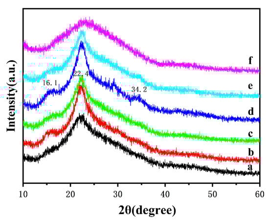 XRD patterns of products from rice straw to RSCA at different stages were depicted in Figure 6, and the characteristic diffraction peak at 22.4° was detected for all the curves in Figure 6, which was assigned to the typical lattice characteristic peaks of cellulose Iβ [38]. As the extraction processes went on, a peak at 16.1° appeared, which was indexed to the typical lattice characteristic peaks of cellulose Iα [39]. This was mainly because the amorphous components such as the lignin and hemicellulose were removed, and the crystalline areas of cellulose were more exposed [40]; as a result, the crystallinity of RSC was enhanced. As seen from Figure 6d, a new characteristic peak near 34.2° appeared for the rice straw-derived coarse cellulose, which proved that the residual hemicellulose and lignin in the pretreated rice straw could be furtherly removed by dilute alkali treatment. For Figure 6e, the characteristic diffraction peaks located at 16.1°, 22.4° and 34.2° were all detected for RSC, and it is suggested that the crystalline form of RSC still belonged to the cellulose I structure after the H2O2 bleaching process of rice straw-derived coarse cellulose. Compared with Figure 6e of RSC, the RSCA in Figure 6f possessed the typical lattice characteristic peaks of cellulose Iβ, and the characteristic diffraction peak at 23.4° was distinctly weakened; moreover, the characteristic diffraction peak at 16.1° and 34.2° completely disappeared, which indicated that the crystallinity of rice straw-derived cellulose was weakened. This was mainly because of the reaction of the hydroxyl group with acetic anhydride during the esterification process, which resulted in the destruction of hydrogen bonds between molecules.