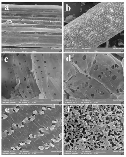 The morphologies of products from rice straw to RSCA at different stages were systematically characterized by SEM. As seen from Figure 7a, the rice straw powder with many stripe trenches displayed a fibrous appearance, and there were many solid particles of lignin and hemicellulose on the surface. As shown in Figure 7b, more spherical particles of absorbed lignin deposited on the surface of pretreated rice straw, which indicated that the dissolved lignin could be effectively removed from the rice straw by means of the C2H5OH/H2O autocatalytic process. When the pretreated rice straw was secondary washed by C2H5OH/H2O solution, the absorbed lignin on the surface of the pretreated rice straw could be effectively removed; meanwhile, the dissolution of lignin inside the cellulose and the degradation of hemicellulose resulted in the generation of numerous holes on the surface of the fiber, which is vividly displayed in Figure 7c. Spherical particles disappeared, and many holes with the pore diameter of 250–1000 nm appeared on the surface. When the dilute alkali treatment process was employed to prepare the rice straw-derived coarse cellulose, it is detected that the pores became bigger with the pore diameter of 500–2000 nm in Figure 7d, which demonstrated that the residual lignin could be furtherly removed in the form of alkali-soluble lignin. When the rice straw-derived coarse cellulose was refined to prepare the RSC by the H2O2 bleaching process, the morphology changed significantly in Figure 7e. Particularly, it is interesting that the RSCA possessed a multi-porous network structure in Figure 7f, which was ascribed to the acetylation reaction between the Ac2O and hydroxyl groups of the cellulose.