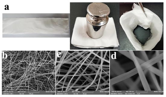 As seen from Figure 9a, it is obviously noted that as-spun RSCA fibrous membrane could be easily folded, unfolded and curled, which demonstrated that the RSCA fibrous membrane was flexible. Furthermore, as shown in Figure 9b–d, the electrospun RSCA fibers displayed a smooth surface with a uniform diameter of approximately 2.5 μm, which could be adjusted by varying the spinning solution and electrospinning parameters, and it is concluded that the as-prepared RSCA was suitable for electrospinning. RSCA fibrous membrane has potential applications in medical materials, food packaging, nursing, catalysis, environmental pollution control and so on.