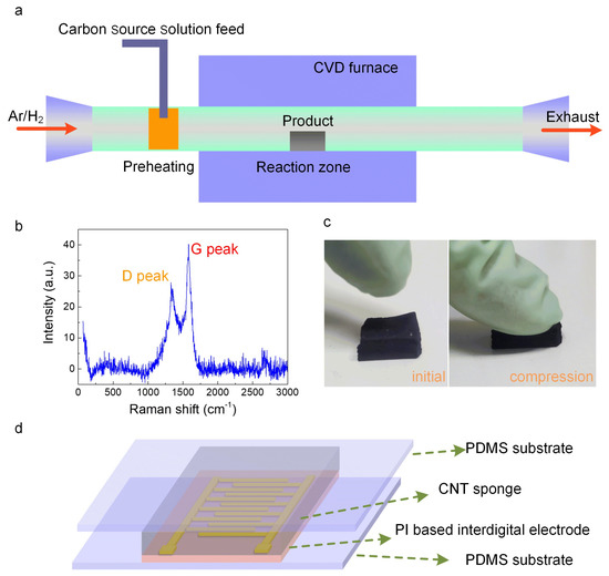 (a) Diagrammatic representation of the device employed for synthesizing the CNTs sponge using the CVD technique. (b) Raman spectra of the CNTs sponge. (c) Photographic macroscopic images of the CNTs sponge before and after compression. (d) The schematic representation of the CNTs sponge-based flexible pressure sensor.