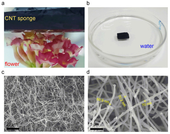 The CNT sponge is characterized by an ultra-low density, reflected by the fact that a 5 cm3 mass of this CNT sponge can be held upon the florets of a flower head with no visible distortion (Figure 2a). Moreover, the CNT sponge can float completely above water, which is additional proof of its ultra-low density (Figure 2b). To acquire a thorough understanding of the microstructure of CNT sponge, a scanning electron microscope (SEM) was used to observe the agglomeration of CNTs in the sponge. Figure 2c,d, respectively, depict the microscopic structural features of CNTs sponge at a low and high power of magnification. As evident in Figure 2c, carbon nanotubes are interwoven into a network structure with very high voltage. Simultaneously, it can be seen that the transverse and longitudinal aspects of carbon nanotube sponges are not different, and rather have isotropic characteristics. The uniformity of the diameter of CNTs is demonstrated via the high magnification SEM images, as shown in Figure 2d. The diameter of CNTs is ~70 nm.