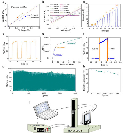 (a) I-V measurements at an external pressure of 5 kPa for forward and backward sweepings of voltages from −1 to 1 V. (b) The straight-line relationship between the I–V curves for the voltage from −1 to 1 V. (c) The I–T curves of the pressure sensor with the various external forces. (d) The stability of the pressure sensor. (e) The sensitivity of the sensor, demonstrating a high sensitivity of 809 kPa−1 under 10 kPa, 223 kPa−1 in the region of transitional pressure (10–20 kPa), and 55 kPa−1 in the region of high-pressure (20–100 kPa). (f) The response time in relation to the loading and unloading pressure of the sensor. (g) The durability of this sensor with press-release 4000 cycles. (h) The sensitivity remained well above 80% of the original value, following 4000 loading–unloading cycles. (i) Schematic illustration of the test system.