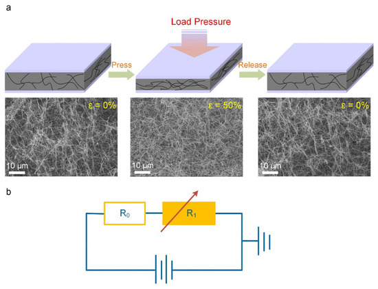 (a) Pressure sensing models of the synthesized CNTs sponge-based sensor under the press-release condition depicts the variation in the contact area of the CNTs network taking place with the compression deformation. The in situ SEM photographs of the CNTs sponge press-release dynamic process: The CNTs sponge in the original state (left), pressed state of ~50% (center), after releasing completely (right). (b) An equivalent circuit representation of the piezoresistive sensor based on CNTs sponge, where R1 is ascertained by the internal voids distance of the CNTs sponge whereas R0 has a constant value.