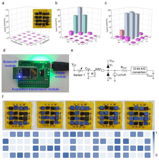(a) The initial response of the 16-pixel pressure sensor array. (b,c) The current response of the pressure sensor array when pressed upon different positions on the device. (d) The physical diagram of the printed circuit board. (e) Block diagram of the readout circuit. (f) Different pressure graphics: physical map and terrain recognition normalized demonstration results.