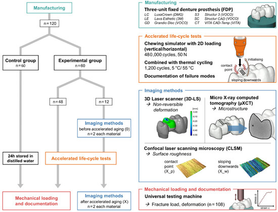 The study was divided into an experimental and a control group. Two FDPs from each material in the experimental group were randomly selected for additional image diagnostics prior and after chewing simulation (Figure 1).