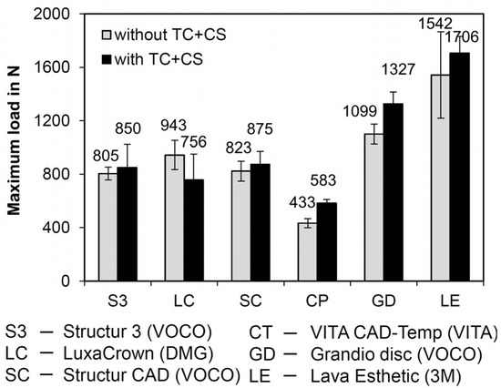 Clinically observed occlusal forces, which usually occur during chewing processes, range from 12 to 90 N. However, occasionally bite forces may even be much higher. Previous studies revealed a mean maximum force in the molar region of 597 N in young healthy women and 847 N in men [36]. In the present study, the breaking forces were higher (>1000 N) in the group of the permanent materials. Nevertheless, fracture forces of S3, LC, and SC were close to the reported upper limit of reported maximum forces. Only CT showed statistically significantly lower values and therefore, the application of this material in long-term restorations can only be recommended with restrictions, e.g., in the anterior region.