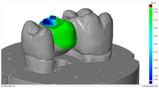 Most temporary FDPs are fabricated in a chairside process using an overimpression technique in combination with autopolymerising resin-based materials. These FDPs are associated with various shortcomings that result from unfavourable conditions during the manufacturing process. Inhomogeneities, like voids or contaminations from the oral cavity, may lead to discoloration, poor mechanical properties, and insufficient fit [7]. Especially for temporary FDPs, mechanical interactions and the fluctuation of temperature in the oral cavity cause stress, which may result in a failure of the interim restoration. Repair or fabrication of a new interim restoration require additional time and increase treatment costs [8].