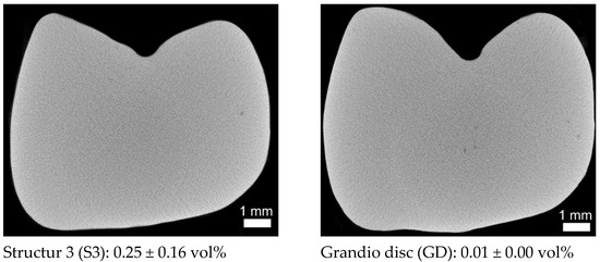 µXCT sectional images from the centre of the three-unit FDPs, each with the total porosity (measured on a region of interest (ROI) 6 mm × 4 mm × 4.2 mm from the centre of the restoration).