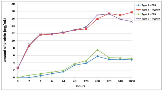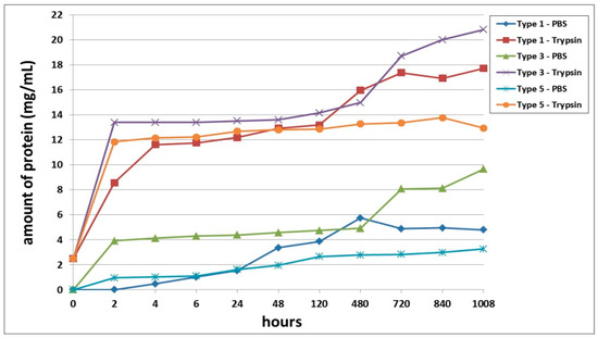 The first series of experimental procedures investigated the passive and enzymatic biodegradation of acellular scaffolds. It was found that passive degradation in the PBS solution proceeded much more slowly than in the trypsin solution (Figure 1). For instance, even after 2 h, the total free protein was determined in the trypsin samples at concentrations of over 8 mg/mL, while the concentration of total protein in samples from scaffolds with bovine collagen (Type 1) with PBS did not exceed 1 mg, and in those from scaffolds with fish collagen (Type 2), no total protein could be detected. However, after 4 h of incubation in PBS, the total protein began to increase rapidly in samples from both types of scaffolds. The peak protein concentrations for the passive degradation (in PBS) of the scaffold samples were observed on Day 20 (480 h) after the start of incubation. It should be noted that the passive biodegradation of the Type 2 scaffolds was marginally faster than that of the Type 1 scaffolds, this being indicated by the higher protein concentrations in the corresponding samples (Figure 1).
