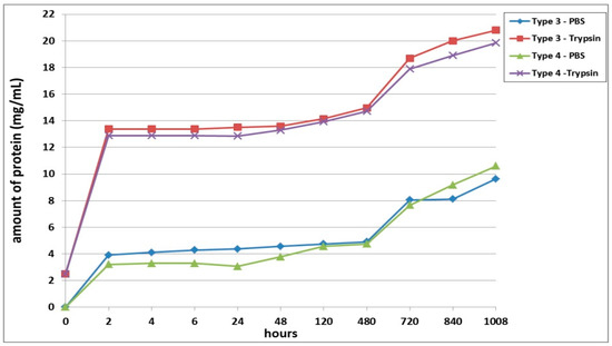 The biodegradation of the scaffolds in trypsin solution proceeded much more rapidly compared to the passive biodegradation. For instance, even after only 2 h of incubation, the samples from both scaffold types showed significantly high protein concentrations (Figure 2). Throughout almost the entire analysis period, the enzymatic biodegradation of the Type 3 scaffolds was more pronounced compared to that of the corresponding Type 4 scaffolds. The increase in protein concentration in the Type 3 scaffold samples during the first 2 days was, on average 3.4% (significantly) higher than the values in the Type 4 scaffold samples. However, in samples taken at 120 h and 480 h, the values of the total protein concentration did not show statistically significant differences between the two types of scaffolds. After 20 days (480 h), the situation then completely changed. On Day 30 of the experiment, statistically significant differences could again be detected for the protein concentrations in samples from Type 3 scaffolds and Type 4 scaffolds, and this situation continued until the end of the experiment. As at the early stages, the Type 3 scaffolds appeared to be degraded more rapidly than the Type 4 scaffolds during this period (720 to 1008 h). Between Day 20 and Day 30, an abrupt increase in protein concentration was seen for both types of scaffolds. For instance, on Day 30, the protein concentration in the Type 3 scaffold samples increased by 20%, and in the Type 4 scaffold samples, by 18%, compared to the values registered on Day 20 (480 h). Subsequently, and until the end of the experiment, the protein concentration in the samples from both types of scaffolds increased, indicating an ongoing process of biodegradation.