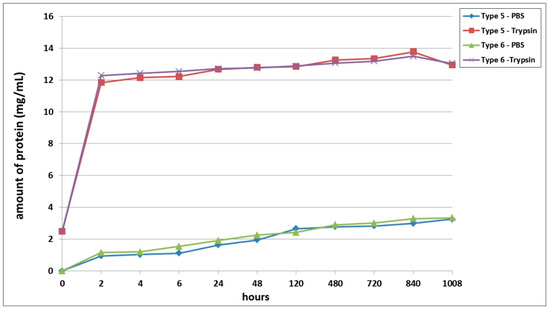 During the analysis of the enzymatic biodegradation results, it was found that 2 h after the start of the experiment, significant protein concentrations could be observed in samples from both types of scaffolds—over 11.5 mg/mL. As with the results of passive biodegradation, the amount of protein in the Type 6 scaffold samples exceeded the values from the Type 5 scaffolds. However, this difference was much smaller and did not exceed 4%. Progressively during the experiment, the protein concentration in samples from both types of scaffolds gradually increased. In the early stages (up to 24 h), the relative differences between the samples from the Type 5 and Type 6 scaffolds remained. Then, during the period from 24 h to Day 20 (480 h), the protein concentration in the samples from both types of scaffolds became equivalent. After 480 h, the biodegradation of the Type 5 scaffolds proceeded marginally faster. However, these later differences were in the range of only 1.5 to 2.1%. At the final point of the experiment (1008 h), the protein concentration in both types of scaffolds decreased, indicating a slowdown or termination of the biodegradation process.