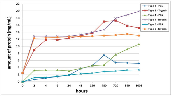 A comparative analysis of the biodegradation of scaffolds with fish collagen—acellular (Type 2), with encapsulated ASCs, pre-cultivated for 24 h (Type 4) or for 6 days (Type 6)—demonstrated dynamics similar to the biodegradation of the scaffolds made with bovine collagen. For instance, during the experiment, the Type 4 scaffolds degraded the fastest. This was typical for both types of degradation (passive and enzymatic). Despite similar general dynamics (compared to the bovine collagen scaffolds) there were some differences in the process of biodegradation of the fish collagen scaffolds. During the very early stages (2–4 h), the passive biodegradation of the Type 2 scaffolds proceeded at the slowest rate. During the period from 6–24 h, the biodegradation of the Type 2 and Type 6 scaffolds in the PBS solution proceeded at corresponding rates. Starting from 48 h, the picture changed significantly. The protein concentration in the Type 6 scaffold samples continued to increase smoothly and reached a plateau by the end of the experiment. Meanwhile, the protein concentration in the Type 2 scaffold samples abruptly increased and reached a peak by Day 20 (480 h). Then, there was a decline. Thus, at a later stage, the Type 2 scaffolds degraded much more rapidly compared to the Type 6 scaffolds (Figure 5). During this period, the situation was similar to the passive biodegradation of the Type 1 and Type 5 scaffolds (Figure 4). The enzymatic degradation of the Type 6 scaffolds in the early stages proceeded much more quickly than the degradation of the Type 2 scaffolds and approached the rate of degradation observed for the Type 4 scaffolds. However, after 48 h, the situation changed and the rate of degradation of Type 2 scaffolds abruptly increased and was significantly higher than that of the corresponding Type 6 scaffolds until the end of the experiment.
