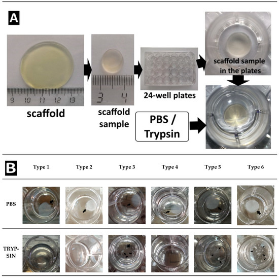 Figure 6 shows a scaffold before its introduction into the experiment (Figure 6A) and views of the scaffold samples after 1008 h of treatment (Figure 6B). When analyzing the photographs, it can be seen that the scaffolds in the process of passive degradation, regardless of their Type, retained their shape and were well visualized. A different picture was observed when analyzing photographs of scaffolds being degraded by trypsin. The Type 1 and Type 2 complete scaffolds could no longer be visualized. In such wells with the Type 1 scaffolds, subtle whitish microfragments of the scaffold could be detected. Some wells with Type 3 scaffolds showed small fragments of the scaffold, although in others they were missing. No scaffold residues could be observed in the wells of the plate with the Type 4 scaffolds, the liquid was transparent. In the wells with the Type 5 and Type 6 scaffolds, residual fragments of the scaffolds could still be easily visualized, which indicated that the degradation process was incomplete.