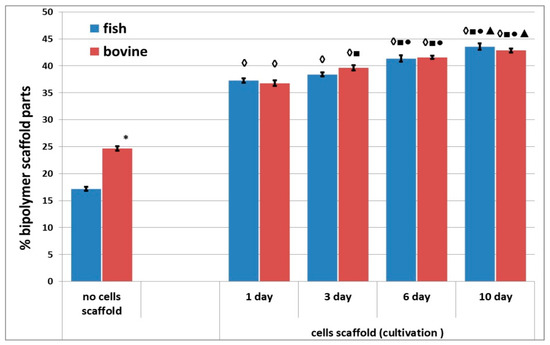 Density of the structure of acellular and cellular scaffolds during cultivation. Note: “Fish” means scaffolds with fish collagen, “bovine”—scaffolds with bovine collagen.∗—p < 0.05 comparison of acellular bovine collagen scaffolds with acellular fish collagen scaffolds; ◊—p < 0.05 comparison of acellular scaffolds; ■—p < 0.05 comparison with Day 1; ●—p < 0.05 comparison with Day 3; ▲—p < 0.05 comparison with Day 6.