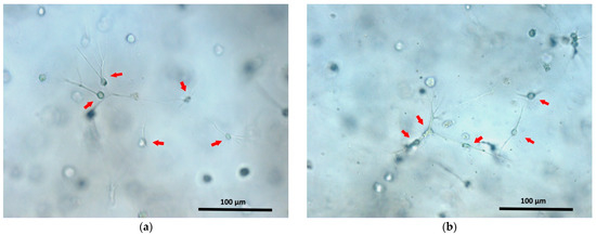 ASCs cultivated for 24 h in fish (a) and bovine (b) collagen scaffolds. The arrows indicate some of the ASCs. Cellular processes are well visualized in adhered ASCs.