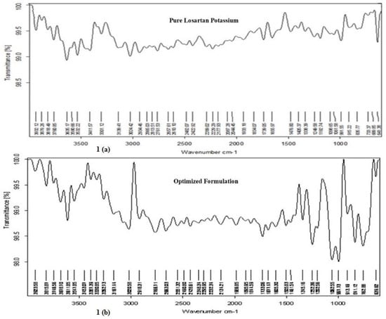 (a) FTIR spectra of pure losartan potassium (LP), (b) FTIR spectra ofoptimized floating tablet formulation (F3).