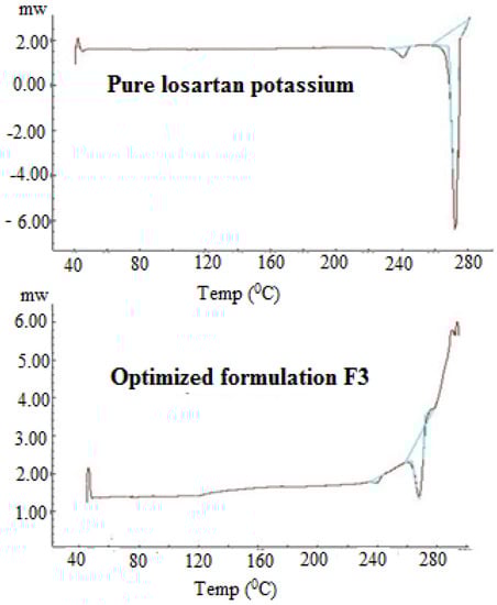 DSC evaluation is a fast and efficient process for checking drug and excipient compatibility and to obtain the most information on possible interactions. Pure LP and its optimized formulation F3 were subjected to DSC analysis. The pure LP thermogram displayed an endothermal high peak at 272.55 °C, which was its melting point. An endothermic peak of LP was slightly shifted to 273.04 °C in the optimized formulations (F3). In addition, the intensity of LP was significantly reduced in optimized formulation F3, suggesting the entrapment of the drug into the polymers used. Because the melting point of LP was slightly changed in optimized formulation F3, it can be concluded that there was no chemical interactions between the LP and the polymers studied (Figure 3).