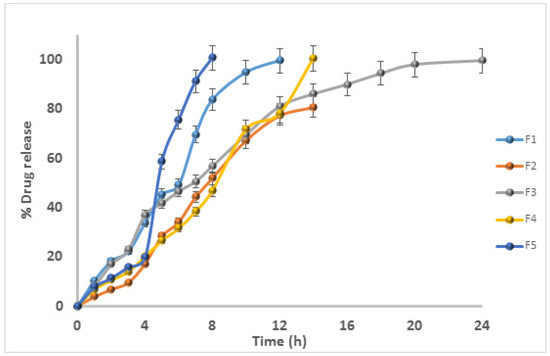 In vitro release profiles of LP floating matrix tablets (F1–F5) (mean ± SD, n = 3.0).