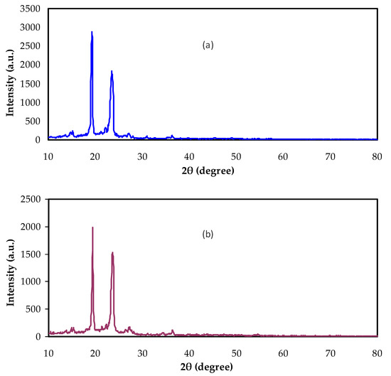 Figure 2 shows the XRD spectra for the neat PEO and composite systems. In Figure 2a, the XRD pattern of pure PEO is shown. We noticed that the crystalline phase dominates that evidenced by the presence of two narrow peaks [23]. Two main domains were seen; firstly, two essential peaks at 18° and 24°, and low-intensity peaks at the high angle appear. PEO polymers’ crystalline and semi-crystalline structures can be recognized from these different diffraction peaks [24,25,26]. The structure of PEO is identified to be both semi-crystalline and linear. The stabilization of the PEO crystalline structure, electrochemically and chemically, was the structural unit’s responsibility. The existence of C-O, C-C, and C-H bonds in PEO caused the polymer to be stable chemically and mechanically [15]. Rajeh et. al. [26], stated that the peaks at around 22° and 18° referred to (112) and (120) planes.