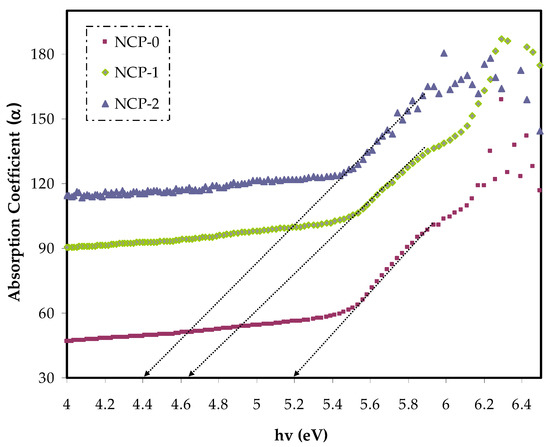 Absorption coefficient against photon energy for NCP-0 and composite films.
