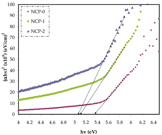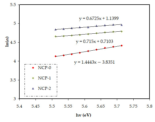 Accurate measurement of the energy band gap provided a clear insight into electron transitions in the band gap structure. Thereby, the optical band gap energy can be considered as a revealing of the optical transition in PEO/CaTiO3 nanocomposite film. The band gap energy was obtained from Tauc’s equation for the parent PEO and related nanocomposite films from the α spectra: