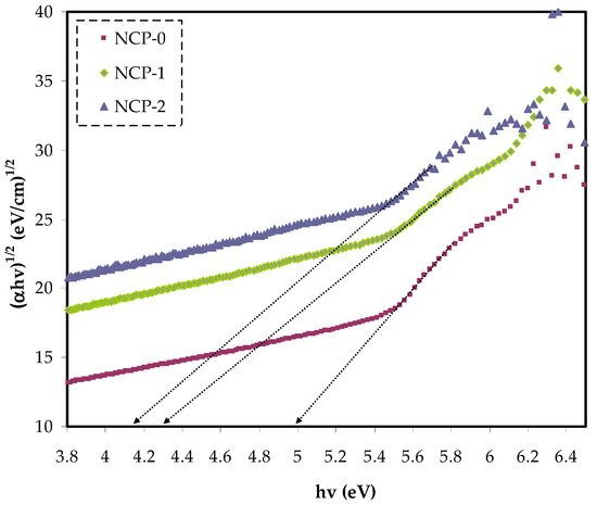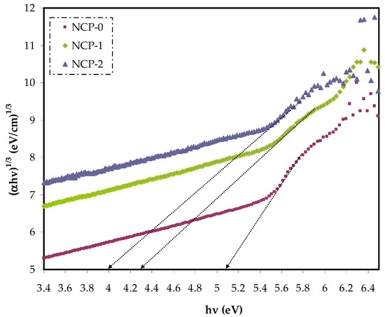 In Equation (4), the parameter reliant on the interband transition probability is B. The incident energy is expressed as hυ. Eg symbolizes the energy band gap, and the index γ defines the kind of electron transition [44]. The value of direct allowed electron transitions (γ) was ½, the γ for indirect allowed transition was 2, for direct forbidden transitions γ was 3/2, and for the indirect forbidden transitions γ was 3 [45]. For determination of Eg value, for the electronic transitions of the direct allowed (Figure 8), direct forbidden (Figure 9), indirect allowed (Figure 10), and indirect forbidden (Figure 11), the intersect of the extrapolated linear part of the diagram of (αhυ)1/γ v hυ with abscissa was used [46]. In earlier research, it was suggested that the cause of decreasing the optical energy band gap could be due to the diverse localized trap states through forbidden band gap. These localized levels were created from the loaded nanoparticles to the polymer [47,48].