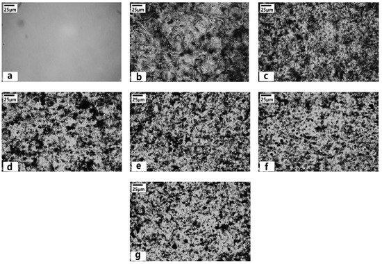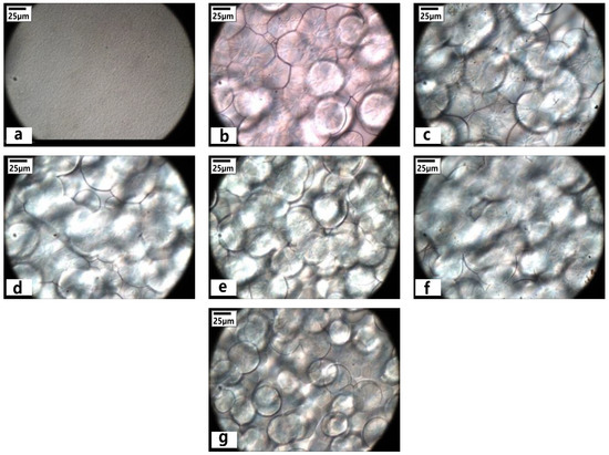 Morphology of spherulites for pure (a) LMPP, (b) iPP, (c) 5%, (d) 10%, (e) 15%, (f) 20% and (g) 25% LMPP blends.