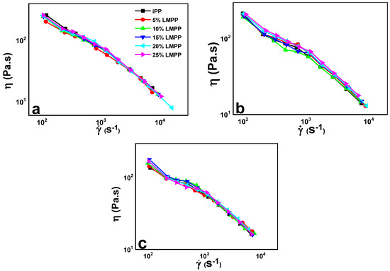 It is demonstrated that the shear viscosity is stable at given temperatures, with increased LMPP content, keeping the rheological flow (capillary rheology) preserved similar to iPP, as shown in Figure 3a–c. This suggests that addition of LMPP in iPP blends will not affect processing extrusion or injection molding. With improved chain mobility the iPP/LMPP melts undergo low shear viscosity at all given temperatures without any flow resistance. It can be deduced that pure iPP and its blends with LMPP demonstrate shear-thinning behavior.