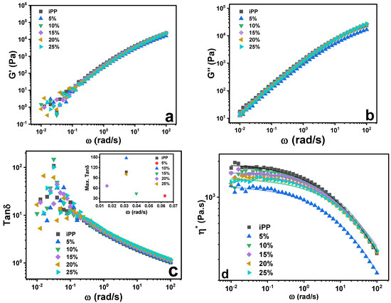 Dynamic rheological response for storage modulus (G′) (a), loss modulus (G″) (b), loss tangent (tanδ) with inset (max. tanδ) (c) and complex viscosity (*η), line ‘fitted with Carreau-Yasuda model (d) as a function of angular frequency (ω) at γ = 0.5% and 150 °C for pure iPP, LMPP and blends.