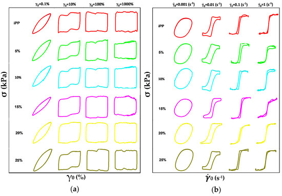 Lissajous curve plots of dynamic stress (σ) against (a) dynamic strain (γ0) and (b) strain-rate amplitude (0) for pure iPP, LMPP and blends at 1.0 rad s−1.