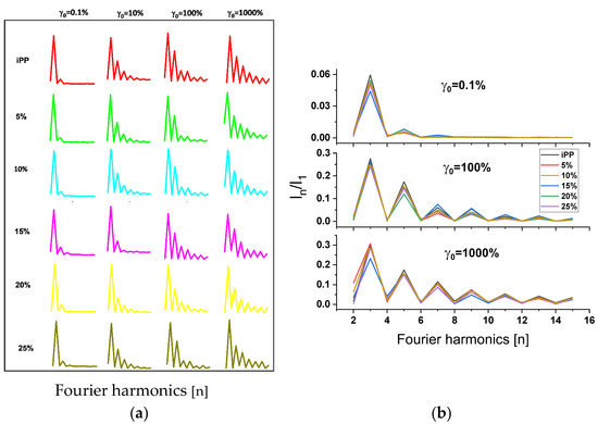 In Figure 6, Fourier transform spectrum shows odd high-order harmonics for nonlinearity from dominant responses of the first harmonic in all samples. From the relative intensities (In/I1), the values of I3/I1, I5/I1 and I7/I1 in the blends reduce at lower γ0, compared to pure iPP. Blends with 15, 20 and 25% LMPP contents showed slightly higher intensities than pure iPP (Figure 6b), indicating LMPP affects viscoelasticity nonlinearities.