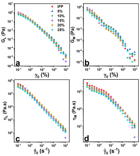 Under LAOS stresses, the blends demonstrated subtle large-strain elastic modulus (GL) and large strain-rate dynamic viscosity (ηL), while minimum-strain elastic modulus (GM) and minimum strain-rate dynamic viscosity (ηM) were influenced with the addition of LMPP as shown in Figure 7. Dependence of GL and ηL with increasing γ0 and 0 in linear to nonlinearity regime was obvious, while GM and ηM were dominant in linear regime. With both GL and GM decreasing with increasing γ0, the blends and pure iPP exhibit overall intercycle strain softening. Whereas decreasing ηL and ηM showed intercycle shear thinning behavior in blends and pure iPP.