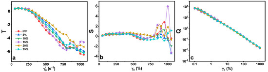 From Figure 8, the elastic nonlinearity perspective of the blends in initial to medium γ0 showed weak intracycle softening (S < 0), while showing intracycle hardening (S > 0) at higher γ0 range, where 20 and 25% predominate compared to pure iPP. The blends’ behavior towards viscous nonlinearity was less arbitrary, where all blends and pure iPP featured shear thinning (T < 0) at medium to high 0. This showed dependence of the intracycle viscoelastic behavior with regards to dimensionless but prominent S nonlinearity in high-content blends compared to T, where there was a gradual decline.