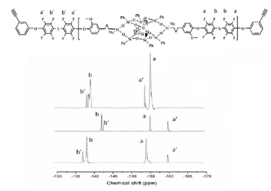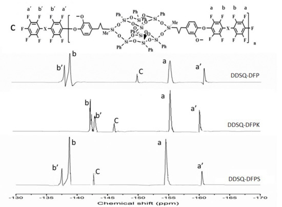 The fluorinated and terminated DDSQ-DFPXs have a general formula, as shown in Figure 1. The X linkages of the monomers are none for DFP, ketone for decafluorobenzone (DFPK), and sulfone for decafluorodiphenyl sulfone (DFPS). The polymerization of DFPX and 2OH-DDSQ was carried out in a two-step nucleophilic aromatic substitution process. In this approach, 2OH-DDSQ was first converted to phenoxide and then further reacted with perfluoro-monomers at a low temperature. The 1H NMR and 19F NMR spectra were measured in a spectrometer (Bruker-Avance III spectrometer 400 MHz, BRUKER, Berlin, Germany) using deuterated dimethyl sulfoxide as the solvent. The 19F spectra are shown in Figure 2, where the spectra contain clear peaks. The corresponding positions of each peak are shown in the figure: a and b, respectively, represent the meta-position and ortho-position of fluorine elements on the polymer skeleton; a’, b’, and c represent the meta-position, ortho-position, and para-position of the fluorine elements of the fluorinated and terminated DDSQ-DFPXs, respectively; the relative integral intensities c:a’:b’ = 1:2:2; and the ratios of the relative integral intensities a:a’ and b:b’ are both equal to 2:1, where the appearance of peaks a’, b’, and c index the correctness of the polymer structure.