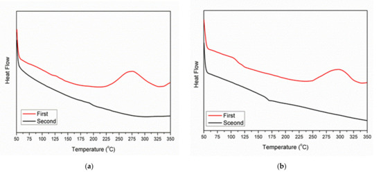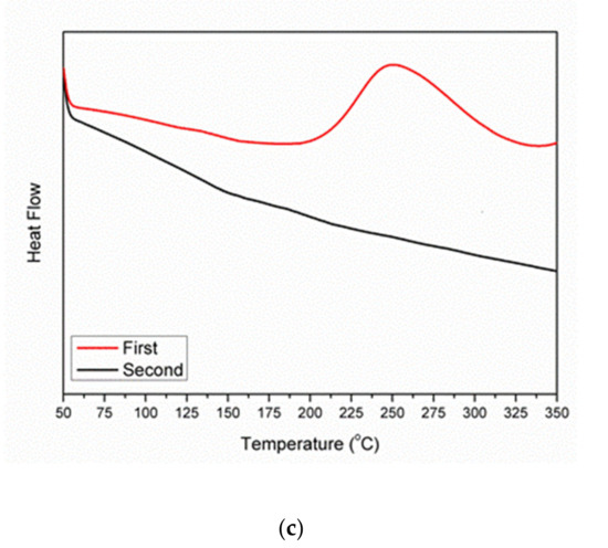 Upon heating, C≡C groups tend to form a crosslinked network via a cycloaddition reaction. The cycloaddition reaction processed was monitored in DSC, and the results are shown in Figure 6a–c. As shown in Figure 6a, DDSQ-DFP-PLA exhibits a glass transition temperature (Tg) at 138 °C and an exothermic peak from 225 to 325 °C, which indicates the wide process window of crosslinking. From the secondary scan curve, a clear thermal glass transition occurred, showing that the first crosslinking was relatively complete. The other two curves follow the same tendency. The results are shown in Table 1. It can be seen that the Tg of the crosslinked polymers are higher than that before, providing a higher use temperature and a broader range ability.