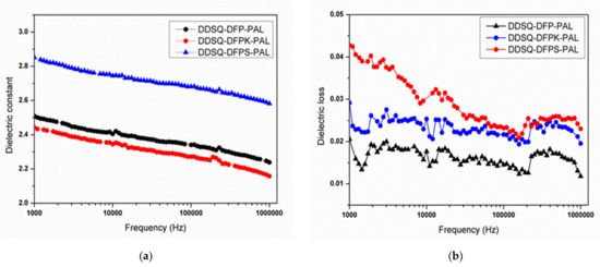 The dielectric constant and dielectric loss of crosslinked DDSQ-DFPXs-PAL were measured according to the standard capacitance method, and the results are illustrated in Figure 10. As shown in Figure 10a, when the frequency is 1 MHz, the dielectric constant values are in the range of 2.17–2.58, where crosslinked DDSQ-DFPK-PAL exhibits the lowest dielectric constant, 2.17. Compared with the other two materials, DDSQ-DFPK-PAL has the highest symmetry, the rigid biphenyl structure makes the polymer molecular chains neatly arranged, and the free volume is relatively small, leading to an increase in the number of molecules per cubic meter. Therefore, the dielectric constant of DDSQ-DFP-PAL is larger than that of DDSQ-DFPK-PAL. On the other hand, since the molecular chain of DDSQ-DFPS-PAL is more polar than DDSQ-DFPK-PAL, the dielectric constant of DDSQ-DFPS-PAL is also larger than that of DDSQ-DFPK-PAL.