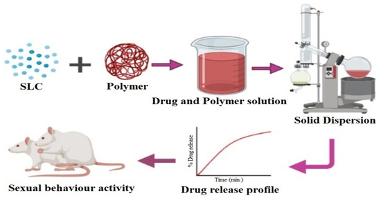 In this study, SDs of SLC were prepared by solvent evaporation method using three hydrophilic polymers as drug carriers, namely Kolliphor® P188, Kollidon® 30, and Kollidon®-VA 64. The prepared SDs succeeded in improving the dissolution rate and sexual behavior in male rats. A marked influence of the polymers on SCL dissolution was noted. All SDs significantly improved the SCL dissolution compared to the pure drug. The optimized SD (SLC-KV64) system showed the maximum enhancement in dissolution rate compared to the pure SLC drug. The DSC and PXRD studies revealed the transformation of the crystalline state of SLC to an amorphous state, which required the lowest energy for drug solubilization. A significant improvement in sexual activity was observed in optimized SD (SLC-KV64) administered male rats, compared to pure SLC drug. Finally, we concluded from this research that the optimized SDs (SLC-KVA64) exhibited superior activity and are a promising strategy for improving solubility, dissolution rate, and aphrodisiac effects on male rats. Hence, the results suggest that the hydrophilic polymer Kollidon®-VA 64 could be an excellent carrier for enhancing the dissolution and therapeutic performance of SLC drug.
