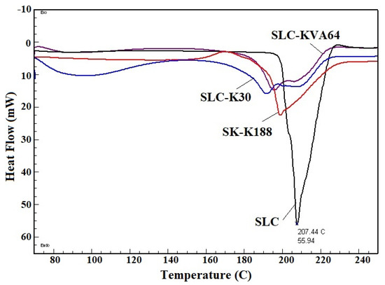 DSC spectra of pure SLC, and their solid dispersions (SLC-K188, SLC-K30, and SLC-KVA64) were recorded using a DSC instrument (SCINCO, DSC N-650, Seoul, Korea) at the temperature range of 50.0–250.0 °C, at a heating rate of 10 °C/min. The instrument was purged with nitrogen gas at a flow rate of 20 mL/min. The DSC apparatus was connected with a sample holder and cooling chamber [32]. Each sample was weighed accurately (approx. 5 mg) and pressed into a hermetically sealed aluminum pan.